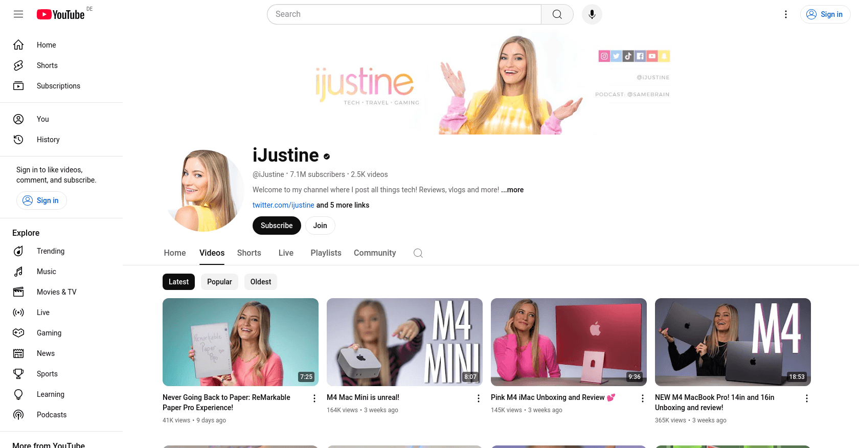 iJustine, whose real name is Justine Ezarik, is a prominent YouTube content creator known for her tech reviews, vlogs, and lifestyle videos. She joined YouTube on May 07, 2006, and has since amassed over 7.1 million subscribers and 1.47 billion video views. For more information, visit iJustine YouTube Channel.