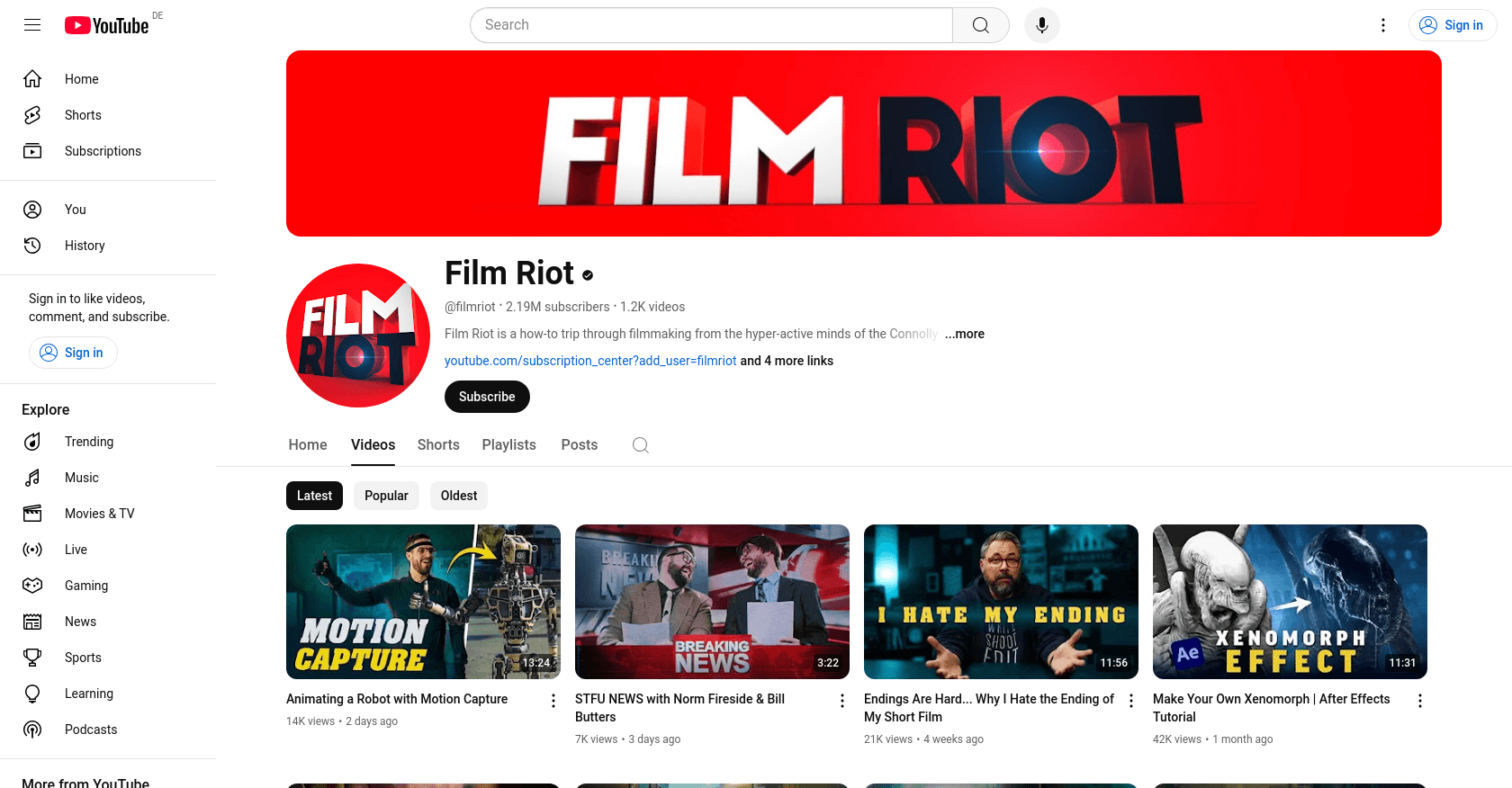 Film Riot, hosted by Ryan Connolly, is a YouTube channel dedicated to filmmaking tutorials, tips, and short films. The channel, run by the Connolly Brothers, joined YouTube on April 16, 2006. With over 2.19 million subscribers, Film Riot offers a unique blend of how-to videos and behind-the-scenes content, making it a valuable resource for both amateur and professional filmmakers.